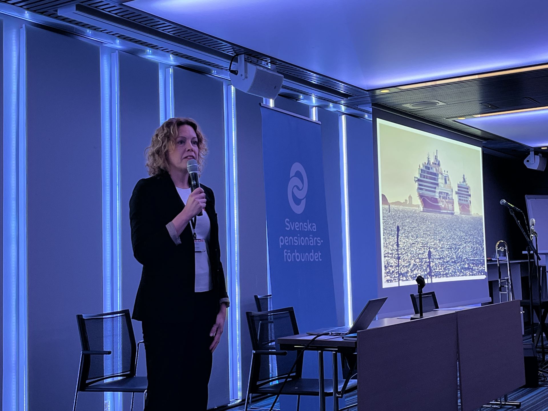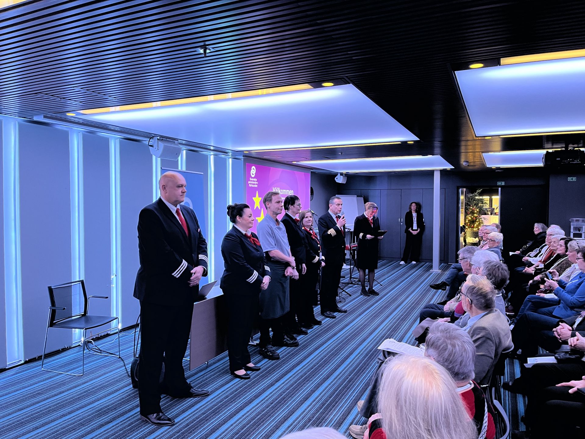 Denna gång fick vi också en presentation och hälsning av befälet som besökte oss i konferensutrymmet. Befälhavare Henrik Grönvik hälsade alla välkomna. Marknadsföringschef Sanna Eriksson från Viking Line berättade om nyheter från rederiet.